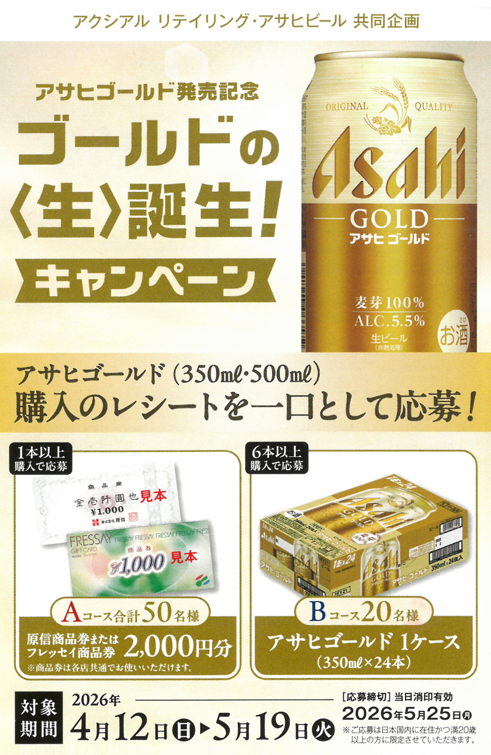 アクシアル リテイリング・アサヒビール「アサヒゴールド発売記念 ゴールドの〈生〉誕生!キャンペーン」