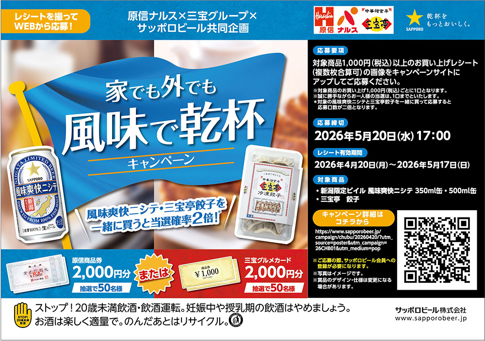 原信ナルス×三宝グループ×サッポロビール「家でも外でも風味で乾杯キャンペーン」